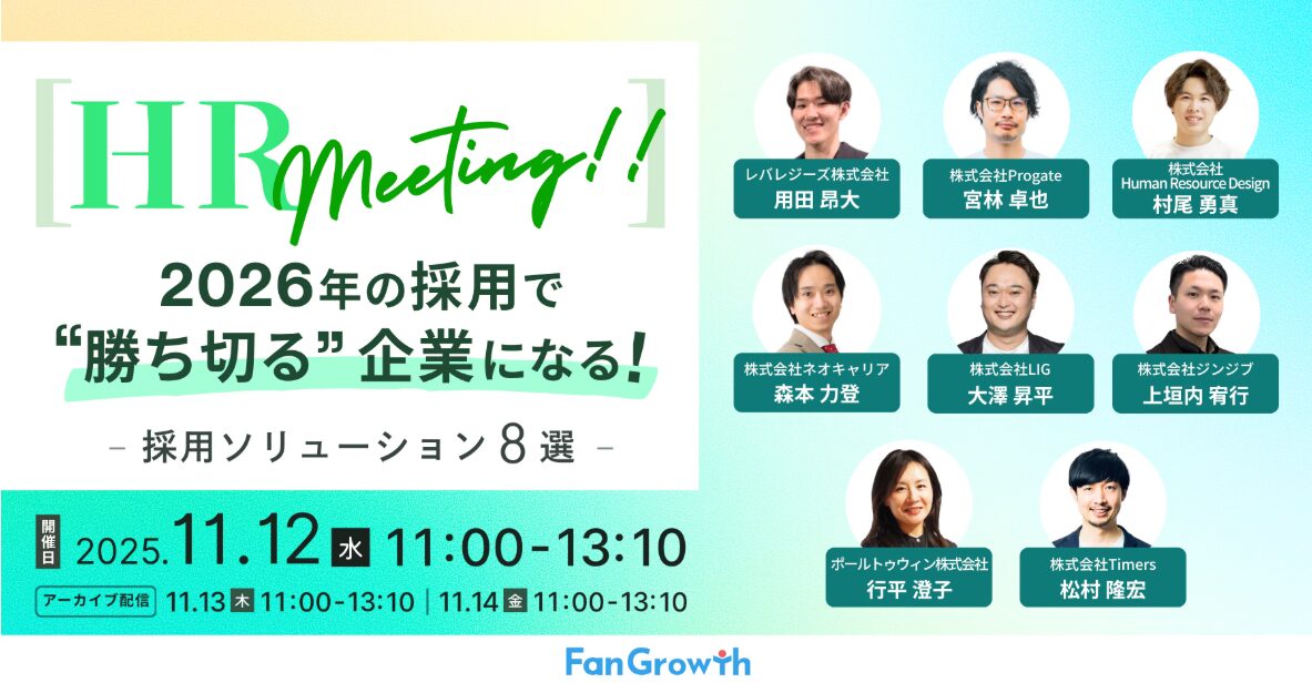 今回は、FanGrowthが主催するイベント『【HR meeting】2026年の採用で”勝ち切る”企業になる!採用ソリューション8選』に出演することになりました。