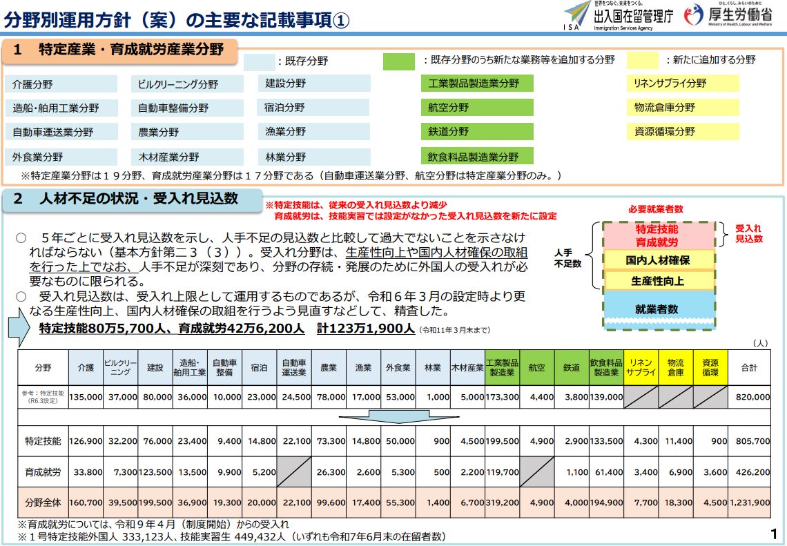 さらに、分野別運用方針(案)(資料2-1)では、具体的な労働力確保の精度であり、特定技能および育成就労(2027年に技能実習制度から移行予定)の産業分野ごとの受入れの計画も明示されています。