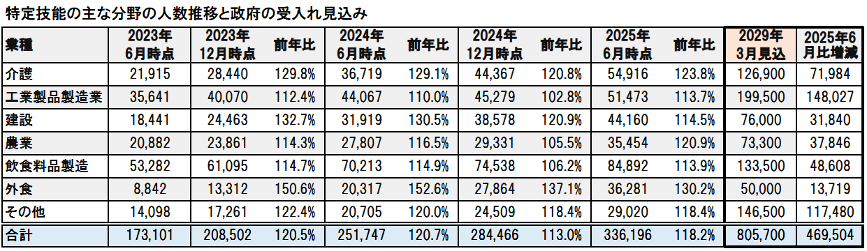 政府は、2029年3月までの受入れ見込み数として、特定技能80万5,700人、育成就労42万6,200人 計123万1,900人としています。技能実習から置き換わる育成就労は減少見込みですが、特定技能は2025年6月の33.3万人から、2029年3月時点で46.9万人増の、80.5万人と倍以上になる見通しです。