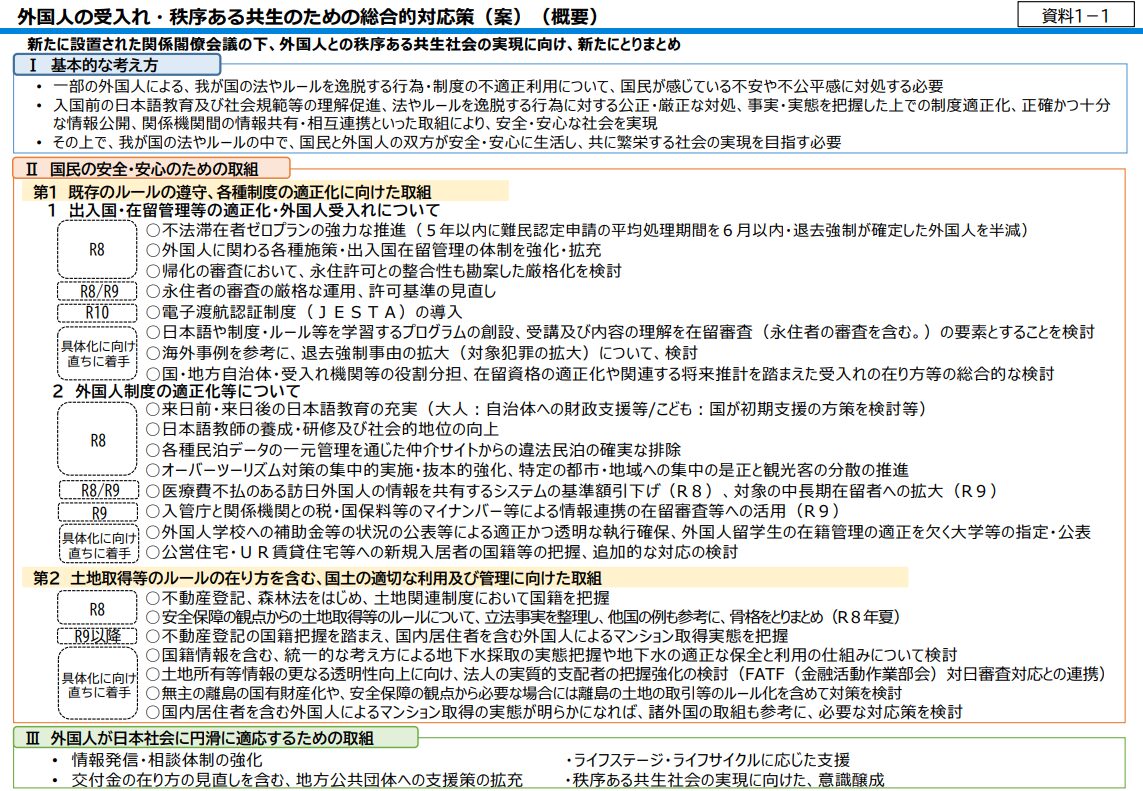 併せて、内閣官房「外国人との秩序ある共生社会推進室」が司令塔機能を担い、国保や医療費未払い、土地・不動産取得の実態把握などの具体施策を束ねています。