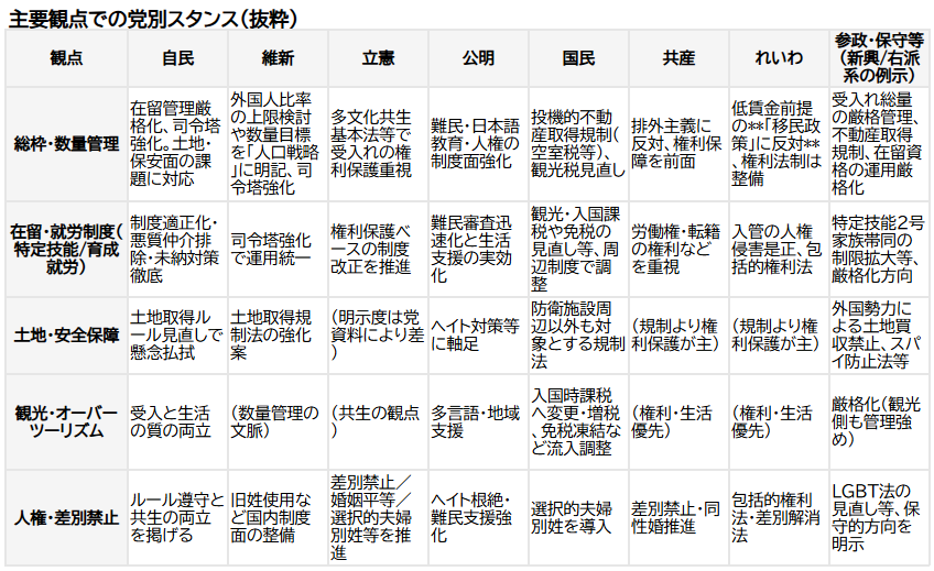 政党:維新などは国全体で「外国人比率上限」等を明示する人口戦略を提案。新興右派は総量抑制・家族帯同制限を強調。一方、立憲・共産・公明は権利保護や共生の制度化を優先。